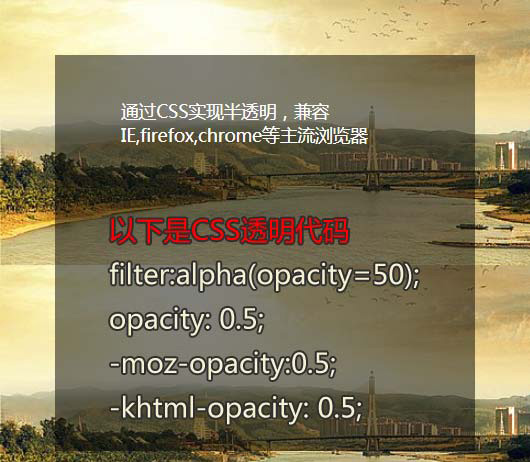 直接上代碼,兼容IE,firefox,chrome,Safari,Opera等主流瀏覽器的半透明CSS代碼: filter:alpha(opacity=50); opacity:0.5; -moz-opacity:0.5; 幾個屬性的意思是: opacity:0.5;CSS的標閱讀全文