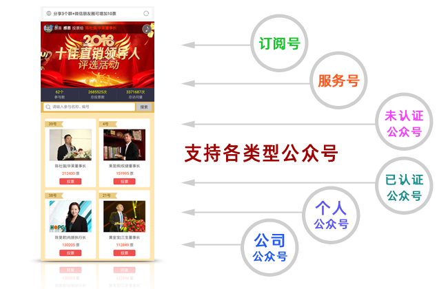 一個投票評選活動可以有多個公眾號參與(可以讓個人公眾號、單位公眾號、訂閱號、服務號、未認證公眾號都可以同時進行一個活動)