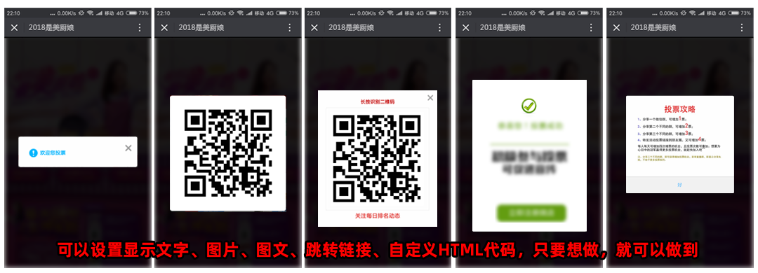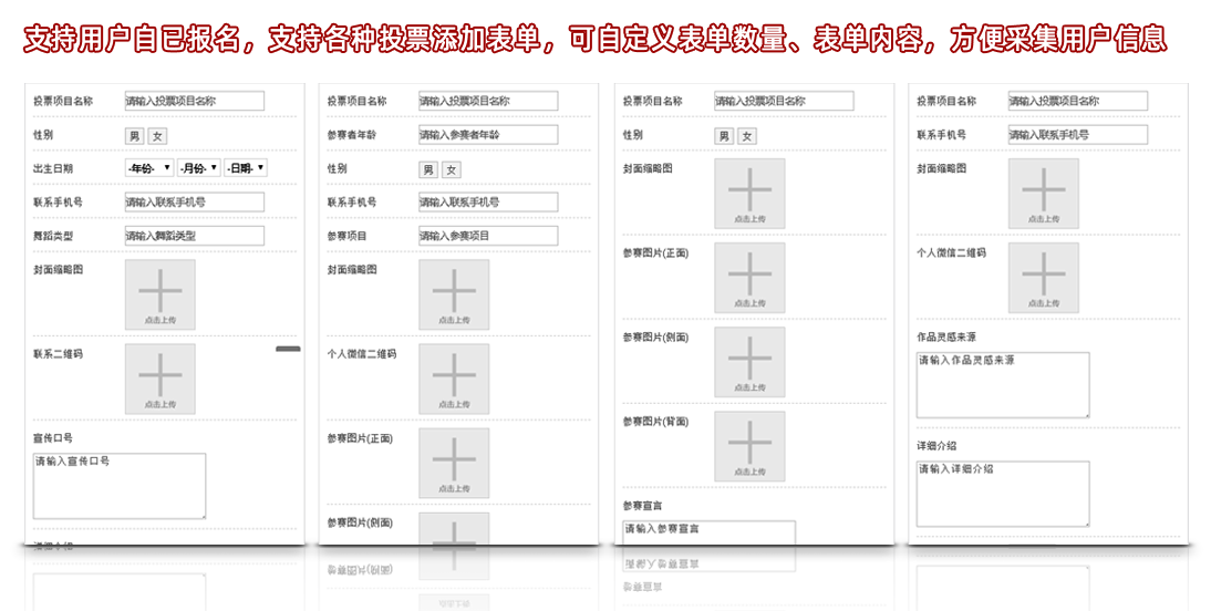 支持單選、多選、多行多列投票、語音、視頻、文字類、圖文等投票