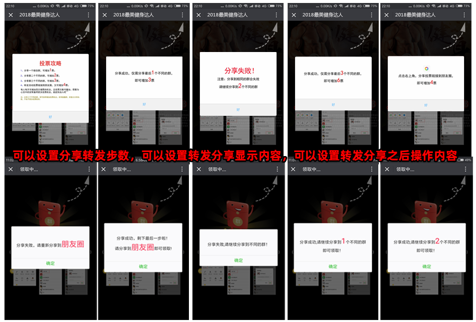 可自定義分享裂變轉發方式,分享給微信好友、分享到群、分享給朋友圈獲得不同的票數與反饋,讓一個選手拉取多位參與人,實現多次分享曝光,讓粉絲漲!漲!漲!